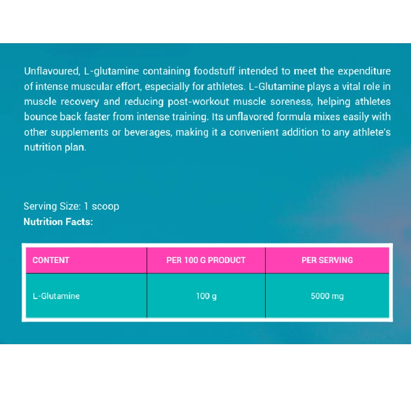 Miami Vibes PURE L-GLUTAMINE – tai grynas, bekvapis ir be skonio L-glutamino milteliais pavidalo papildas, sukurtas intensyviai sportuojantiems asmenims. Glutaminas yra viena svarbiausių aminorūgščių, kuri prisideda prie greitesnio raumenų atsistatymo, padeda sumažinti raumenų skausmą po treniruočių bei palaiko imuninę sistemą.