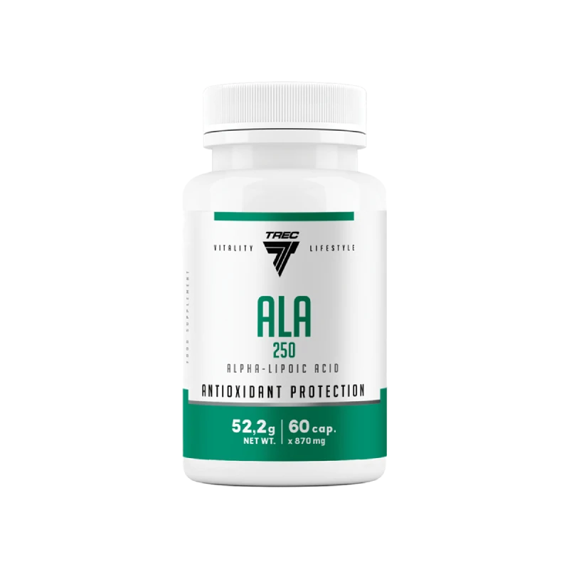 TREC ALA 250 – tai maisto papildas, kuriame yra alfa-lipoinės rūgšties (ALA), natūraliai žmogaus organizme aptinkamos medžiagos, pasižyminčios stipriomis antioksidacinėmis savybėmis . Ši rūgštis padeda neutralizuoti laisvuosius radikalus, gali palaikyti sveiką cholesterolio lygį ir skatinti gliukozės apykaitą .